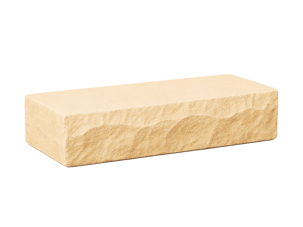 Die bossierte Vorderseite, auch als spaltrau bezeichnet, wird gezielt unregelmäßig ausgearbeitet, um den natürlichen Bruch des Steins sichtbar zu machen. Diese Bearbeitung hebt die natürliche Struktur des Sandsteins hervor und verleiht den Blockstufen eine authentische, handwerkliche Anmutung.